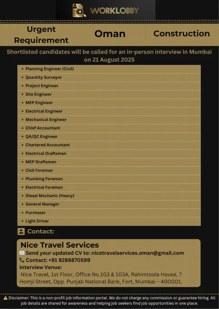 Oman Big Construction Company Recruitment β Client Interview in Mumbai on 21 August 2025 A leading construction company in Oman,