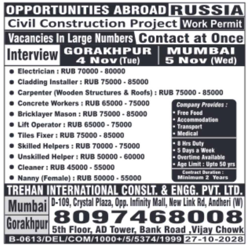 # Electrician, Cladding Installer, and Carpenter Jobs in Russia – Multiple Positions We are seeking skilled workers for a civil