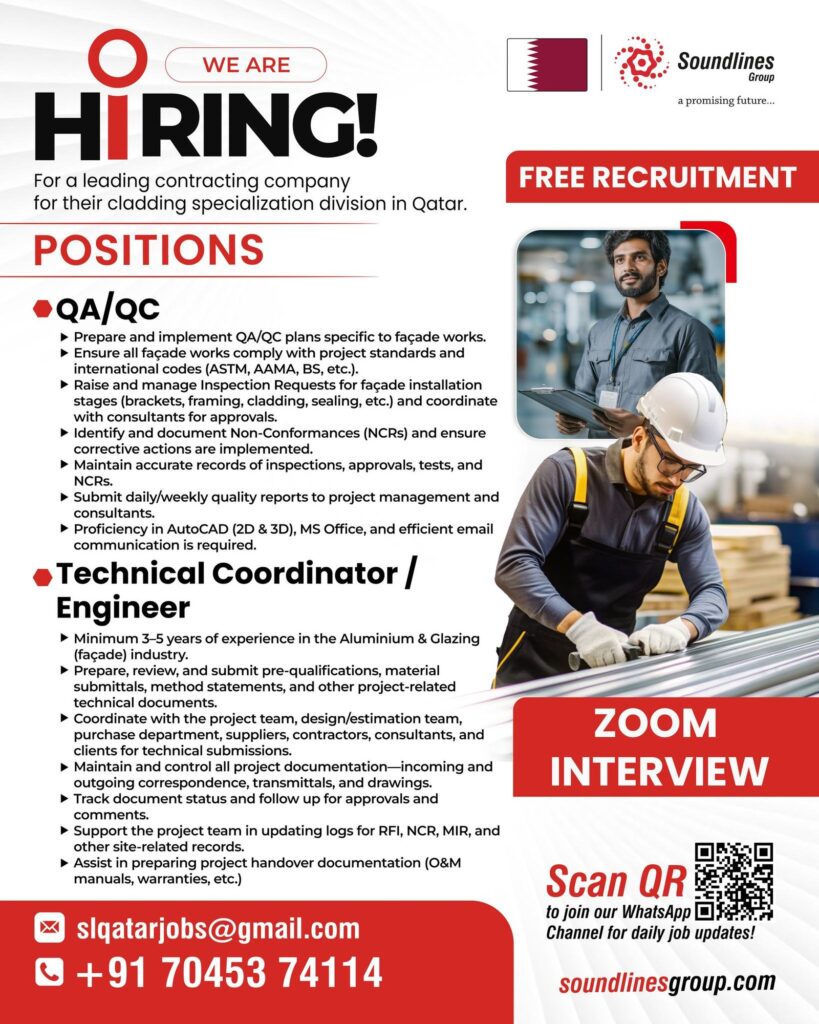 # Engineering Jobs in Qatar – Technical Coordinator/Engineer We are seeking experienced professionals to join a leading contracting company’s cladding