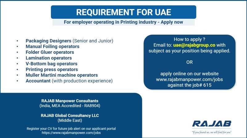 # Printing Jobs in UAE – Packaging Designers, Operators, and Accountant We are seeking skilled professionals to join a leading