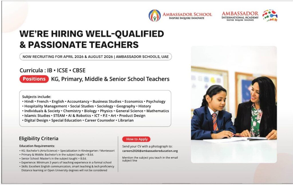 # Teacher Jobs in UAE – Ambassador Schools We are seeking well-qualified and passionate teachers to join our team at