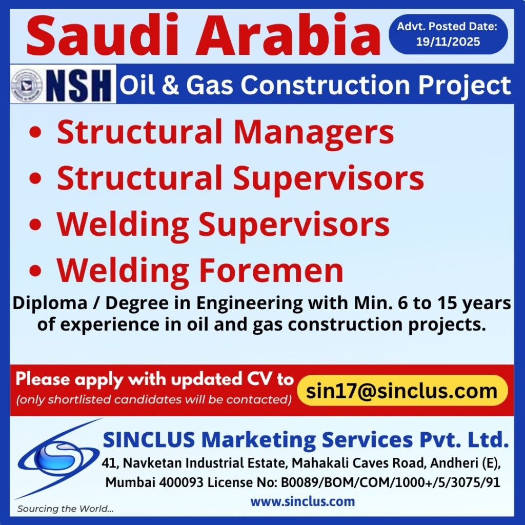 # Structural and Welding Jobs in Saudi Arabia – Structural Managers, Structural Supervisors, Welding Supervisors, Welding Foremen We are seeking