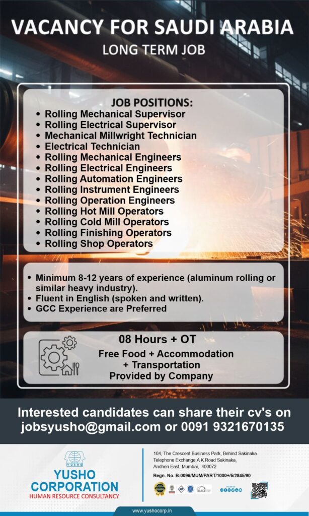 # Rolling Mill Jobs in Saudi Arabia – Rolling Mechanical Supervisor, Rolling Electrical Supervisor, Mechanical Millwright Technician, Electrical Technician, Rolling