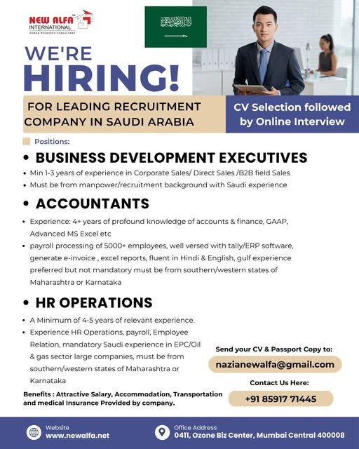 # BUSINESS DEVELOPMENT, ACCOUNTANT, AND HR OPERATIONS Jobs in Saudi Arabia – Leading Recruitment Company We are seeking highly skilled