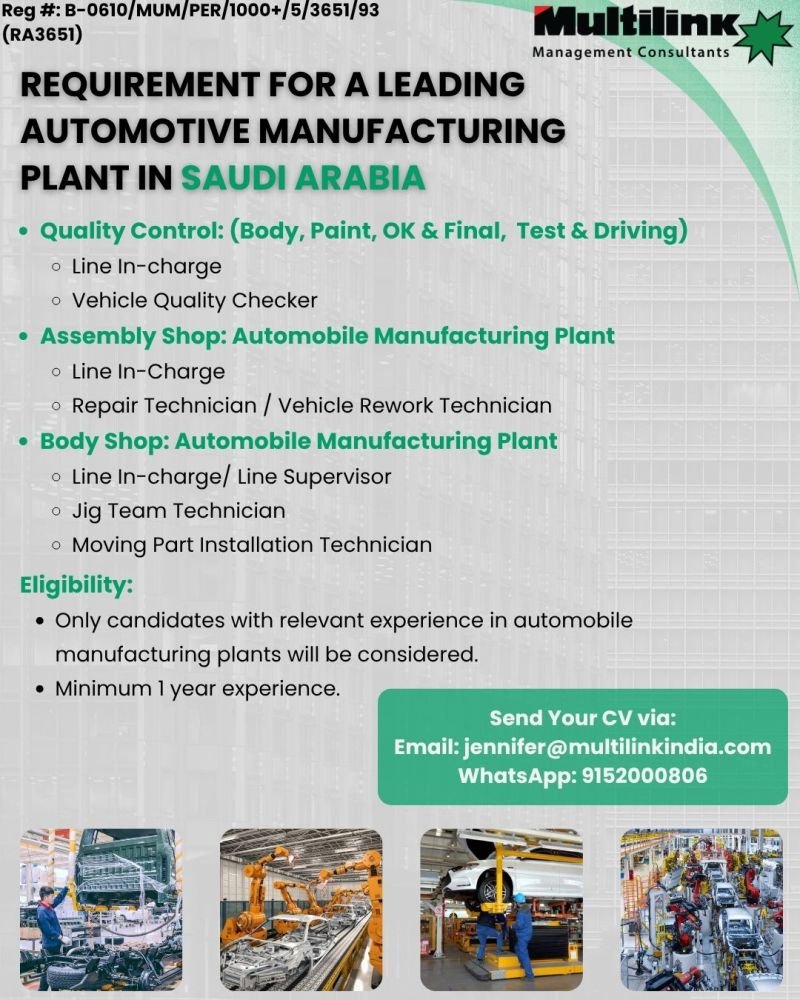 # Automotive Manufacturing Jobs in Saudi Arabia – Quality Control, Assembly, and Body Shop We are seeking experienced professionals to
