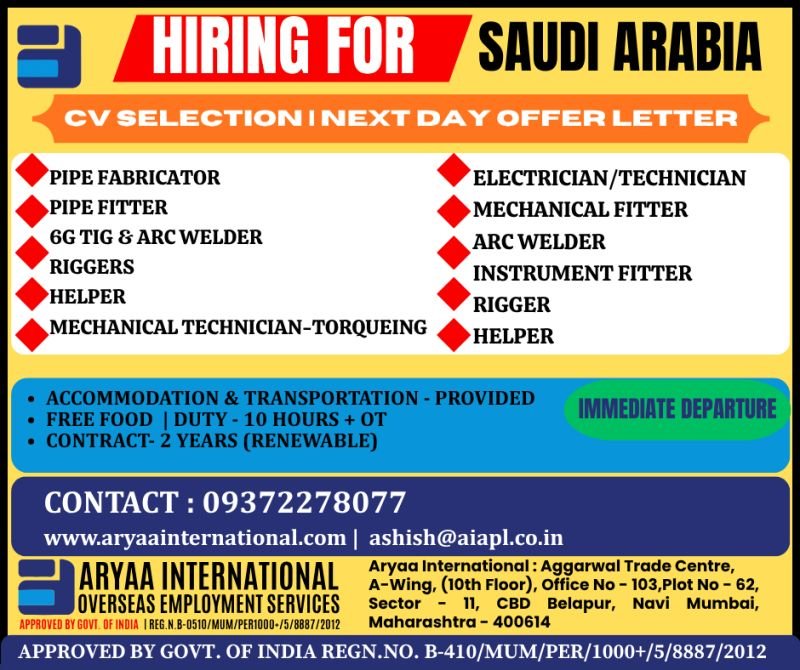 # Electrician/Technician Jobs in Saudi Arabia – Pipe Fitter, Mechanical Fitter, and Welder We are seeking skilled technicians and tradespeople […]