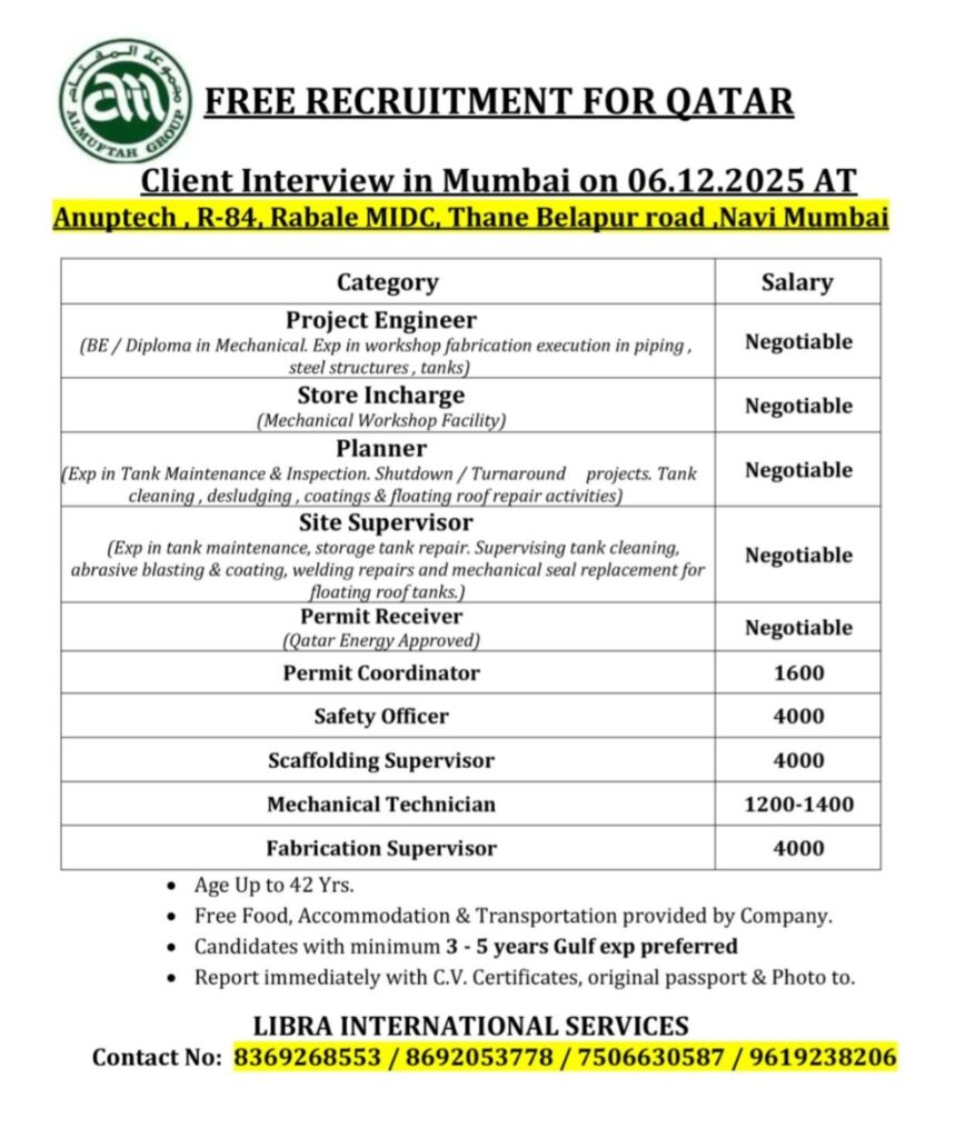 # Engineering and Supervisory Jobs in Qatar β Project Engineer, Store Incharge, Planner, Site Supervisor, Permit Receiver, Permit Coordinator, Safety