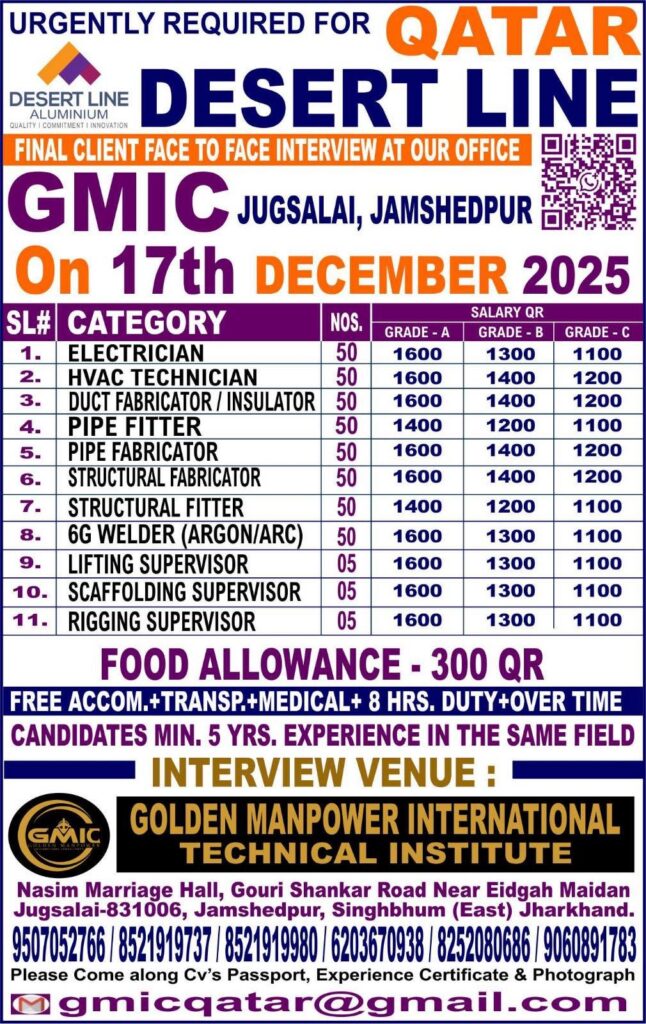 # Industrial Jobs in Gulf – Machinist, Electrician, Storeman, Vulcanizer, Cook, Structural Fabricator, Crusher Fitter We are seeking skilled professionals