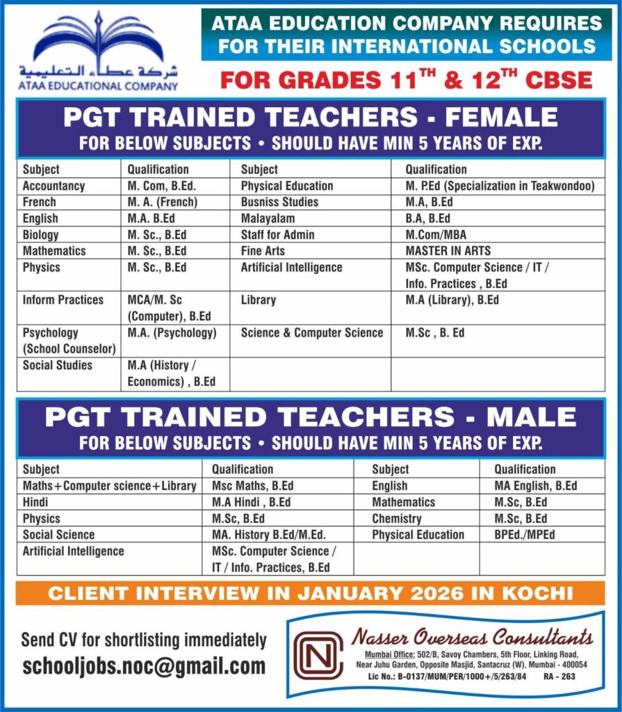 # PGT Trained Teacher Jobs in Gulf – Various Positions We are seeking experienced PGT trained teachers for various subjects