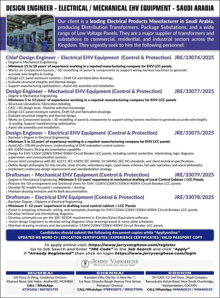 # Design Engineer Jobs in Saudi Arabia – EHV Equipment Our client is a leading Electrical Products Manufacturer in Saudi