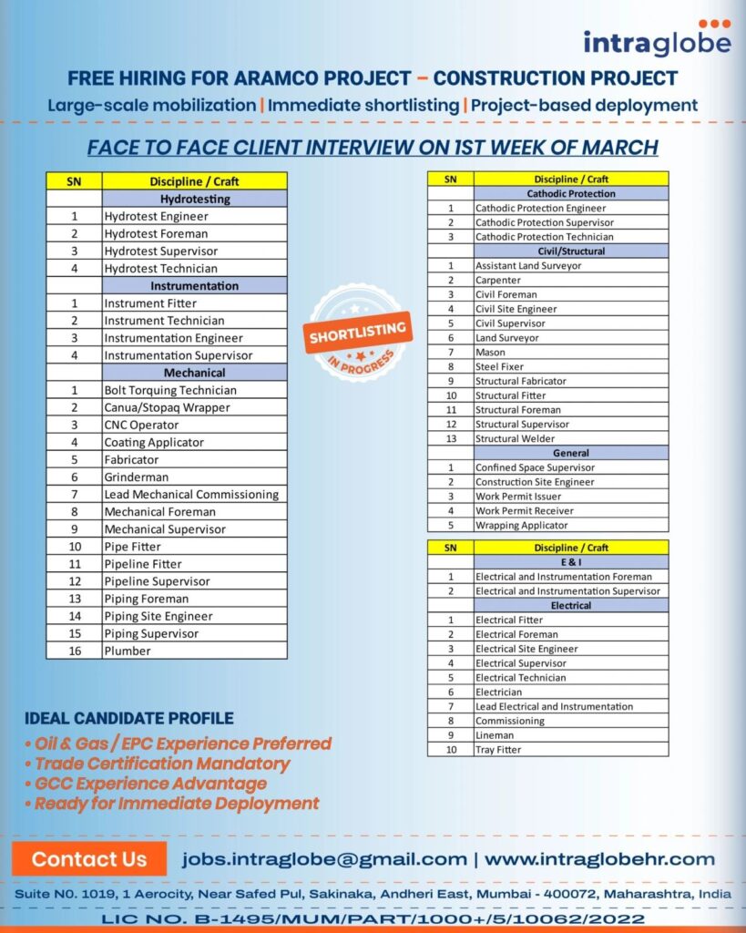 # Construction Jobs in Saudi Arabia – Aramco Project We are seeking experienced professionals for an Aramco construction project in