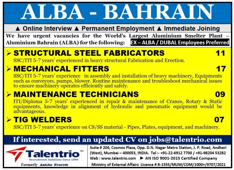 # Structural Steel Fabricators, Mechanical Fitters, Maintenance Technicians, and TIG Welders Jobs in Bahrain – Multiple Positions We have urgent