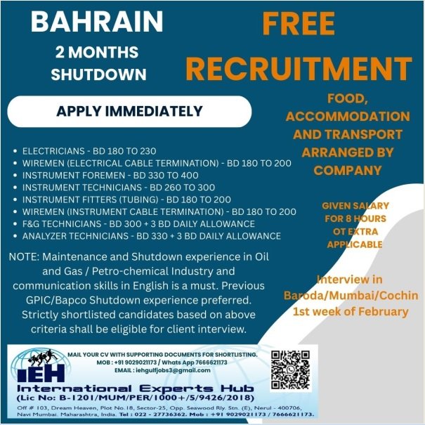 # Electrician Jobs in Bahrain – Instrument Technicians, Wiremen, and More We are seeking experienced professionals for a 2-month shutdown