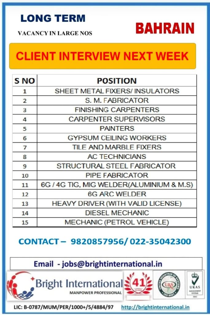 # Plumber, Electrician, and Other Jobs in Bahrain – Various Positions We are seeking skilled workers for various positions in