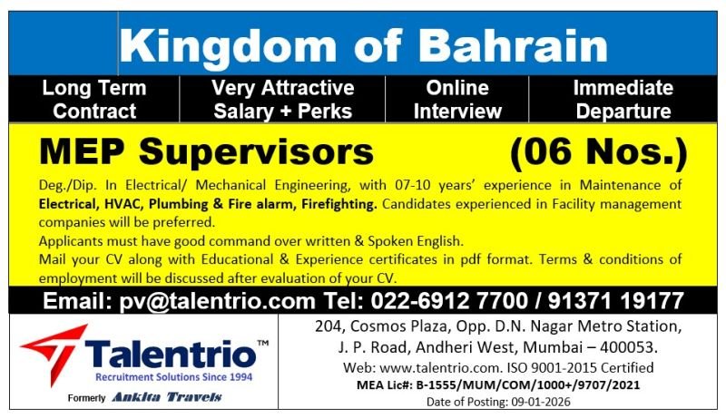 # MEP Supervisor Jobs in Bahrain – 06 Positions We are seeking experienced MEP Supervisors to join our team in