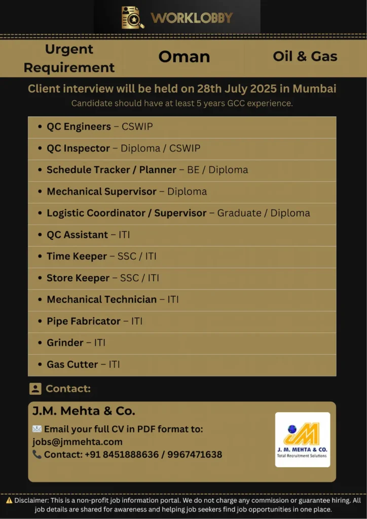 Oman Big Construction Company Recruitment – Client Interview in Mumbai on 21 August 2025 A leading construction company in Oman,