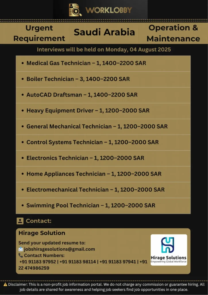 Now Hiring: Maintenance Jobs in Saudi Arabia – Riyadh & Dammam (Hospital Projects) Are you looking for maintenance job opportunities