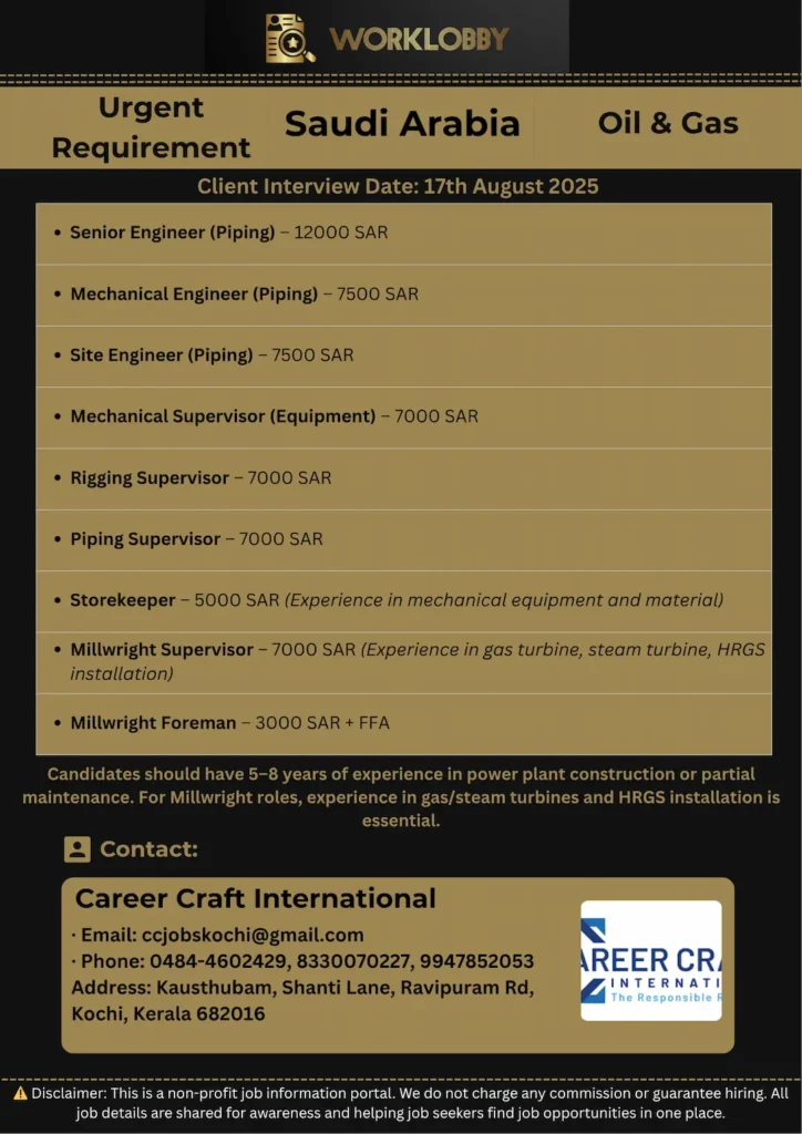SRACO Saudi Arabia Jobs – Final Interview in Jamshedpur 14 August SRACO Saudi Arabia jobs are open for a final