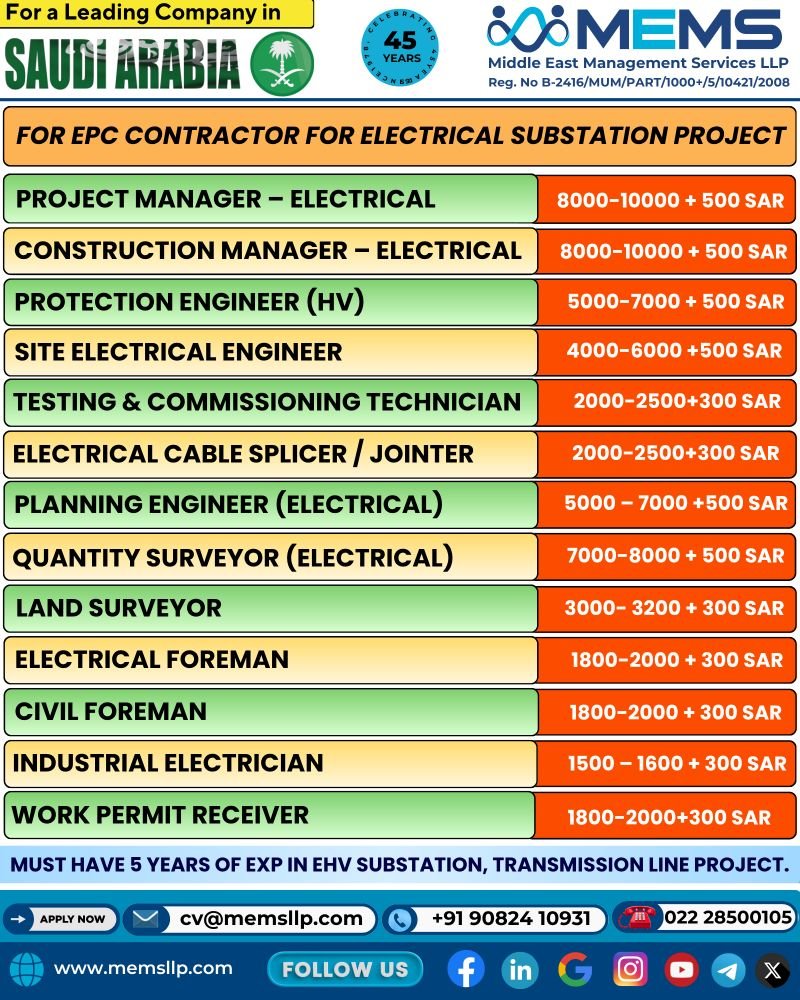 Title: Electrical Jobs in Saudi Arabia – Project Manager, Construction Manager, and More We are seeking experienced professionals for various