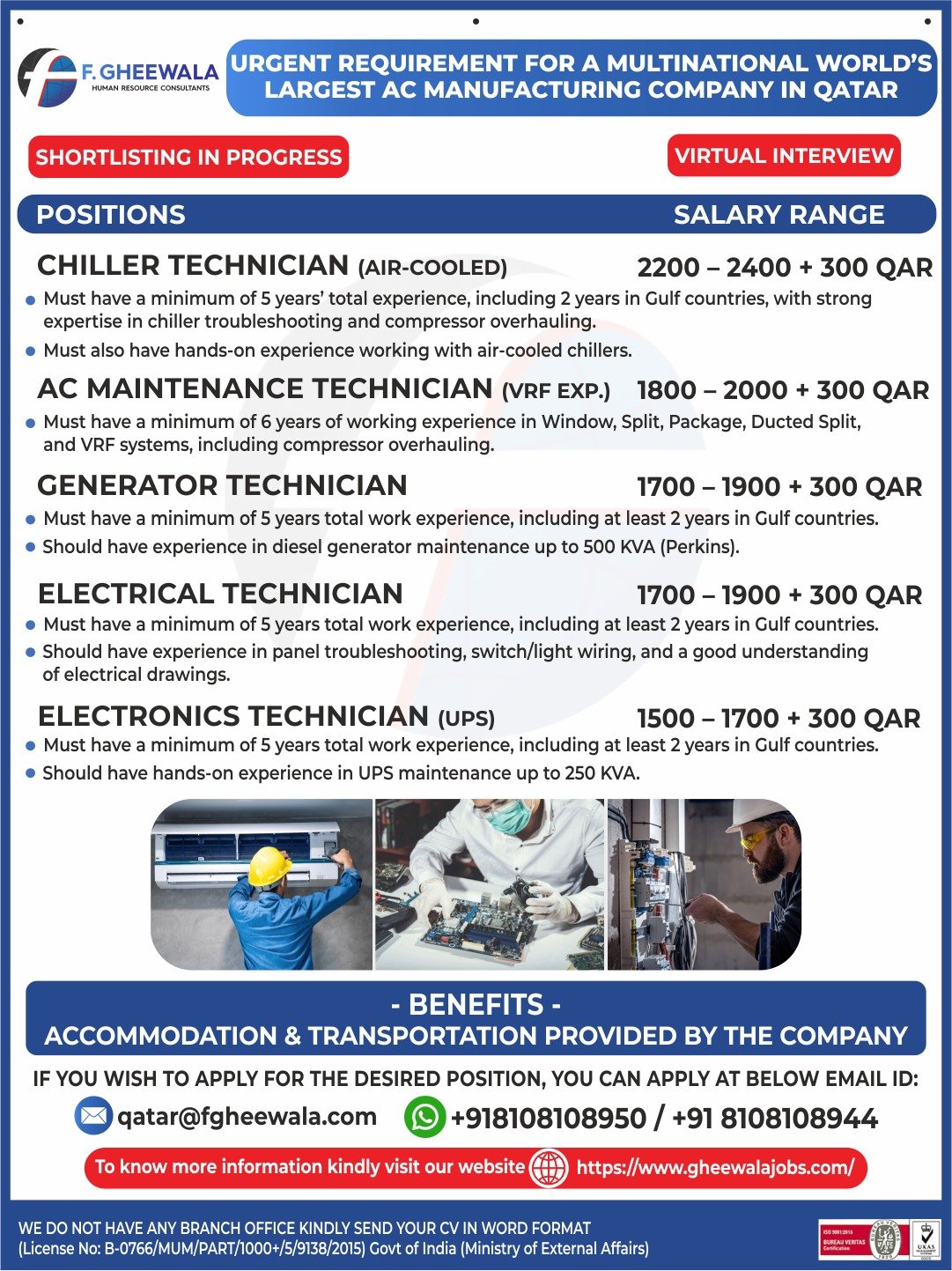 We are seeking experienced technicians to join a multinational company in Qatar. The ideal candidates will have strong expertise in their respective fields and a minimum of 5 years of total experience. The company is the largest AC manufacturing company in Qatar and offers a competitive salary range.