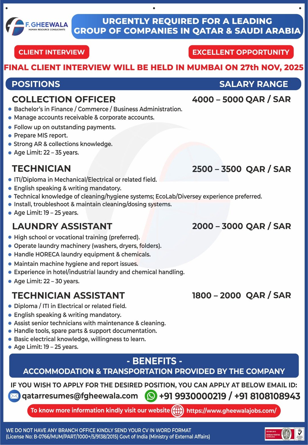 # Collection Officer, Technician, Laundry Assistant, and Technician Assistant Jobs in Qatar & Saudi Arabia – Multiple Positions