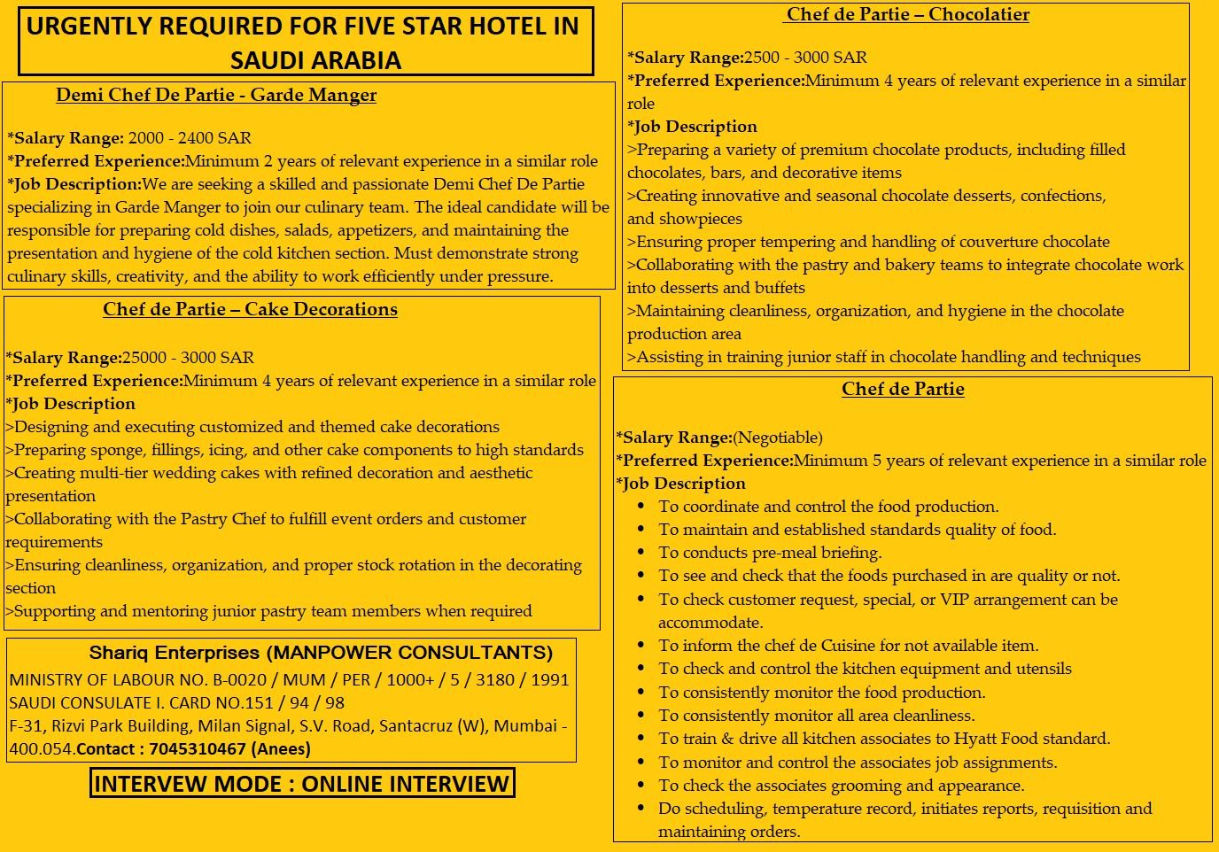 – Demi Chef De Partie (Salary Range: 2000 – 2400 SAR)