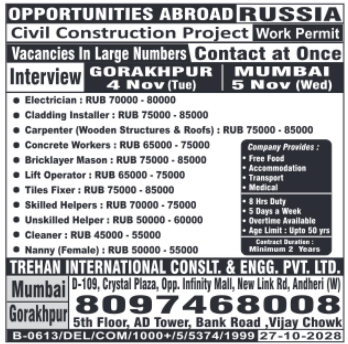 We are seeking skilled workers for a civil construction project in Russia. The project offers a range of positions with competitive salaries. Successful candidates will have the opportunity to work on a challenging and rewarding project.