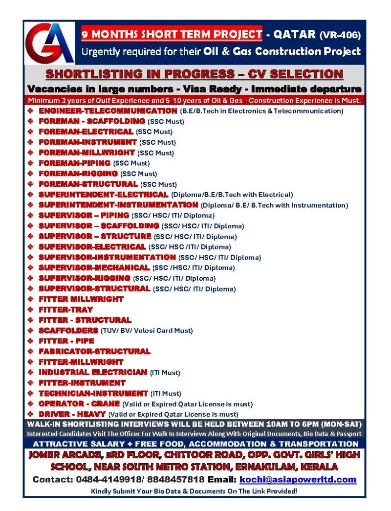 We are seeking experienced professionals for a 9-month short-term project in Qatar’s Oil & Gas Construction sector. The ideal candidates will have a minimum of 3 years of Gulf experience and 5-10 years of experience in the Oil & Gas Construction industry. The project offers attractive salaries and benefits, including free food, accommodation, and transportation.