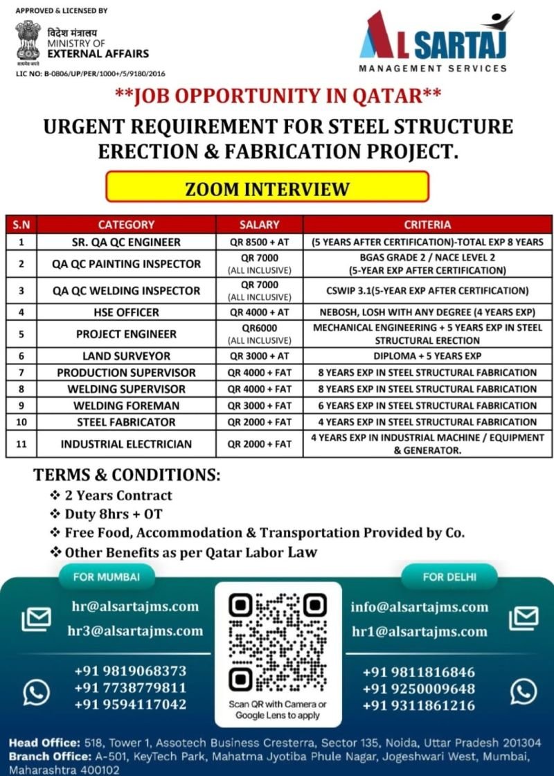 We are seeking experienced professionals for a steel structure erection and fabrication project in Qatar. The ideal candidates will have relevant experience in their respective fields and be able to work in a fast-paced environment.