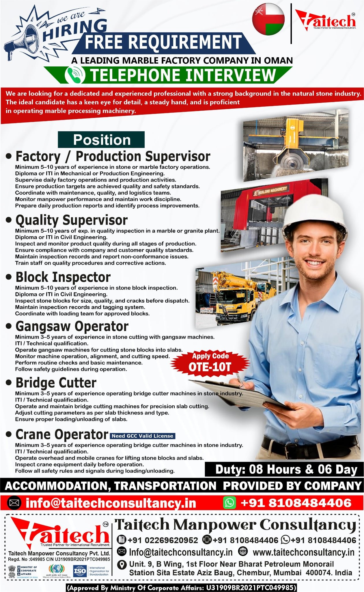 A leading marble factory company in Oman is seeking experienced professionals to join their team. The company is looking for individuals with a strong background in stone or marble factory operations, quality inspection, and machine operation. The ideal candidates will have a diploma or ITI in relevant fields and a minimum of 3-10 years of experience.