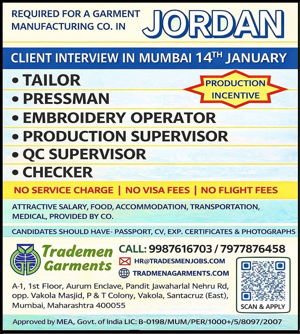 # Garment Manufacturing Jobs in Jordan – Tailor, Pressman, Embroidery Operator, Production Supervisor, QC Supervisor, Checker