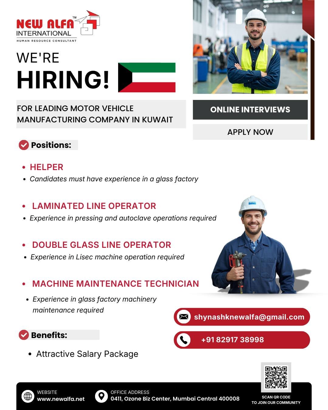 We are seeking experienced candidates for a leading motor vehicle manufacturing company in Kuwait. The ideal candidates will have relevant experience in a glass factory and be skilled in various operations. This is a great opportunity to join a renowned company and work in a dynamic environment.
