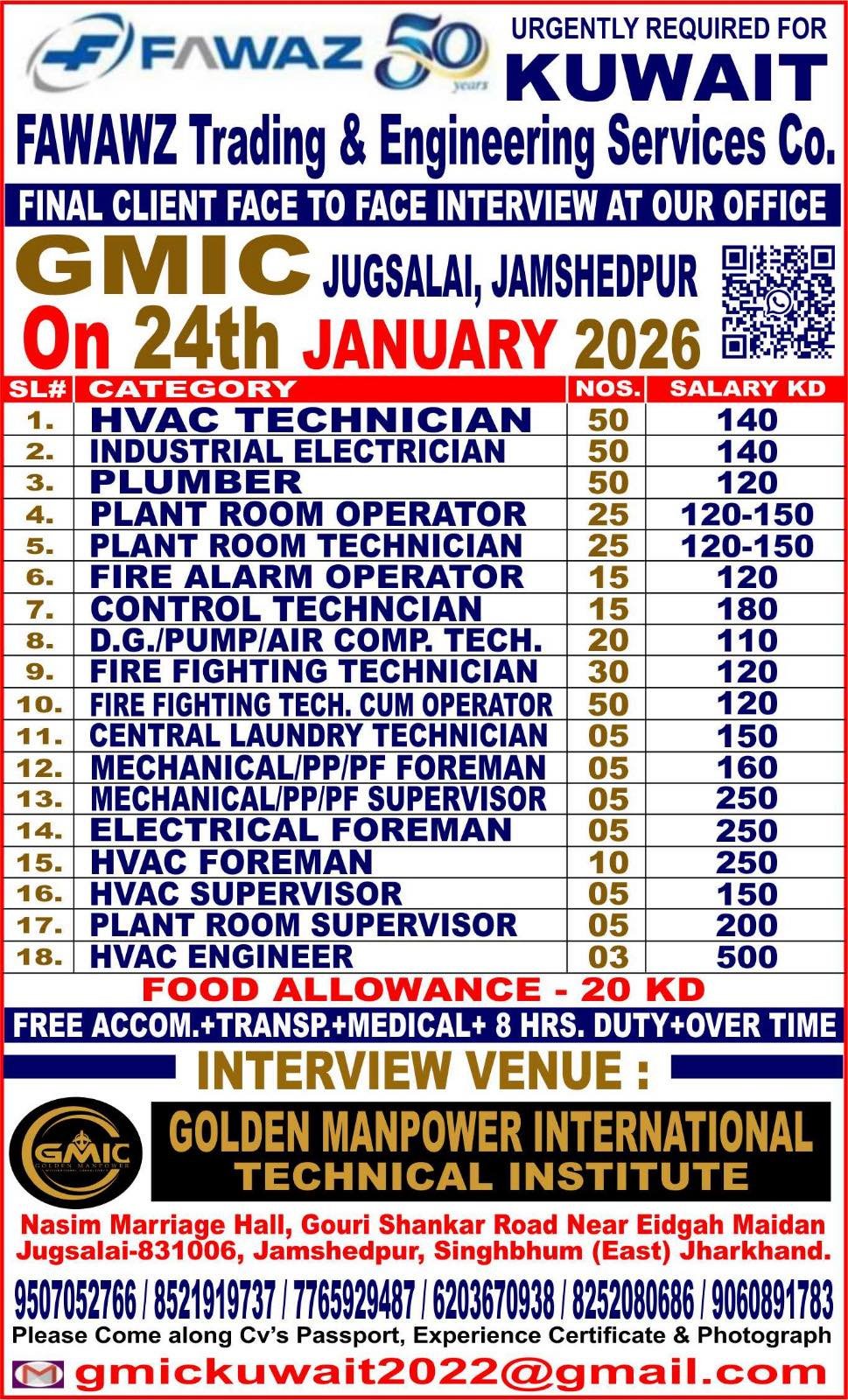 We are seeking skilled technicians to join our team in Kuwait. The ideal candidates will have experience in their respective fields and be able to work well in a fast-paced environment. The company offers a range of benefits and competitive salaries.