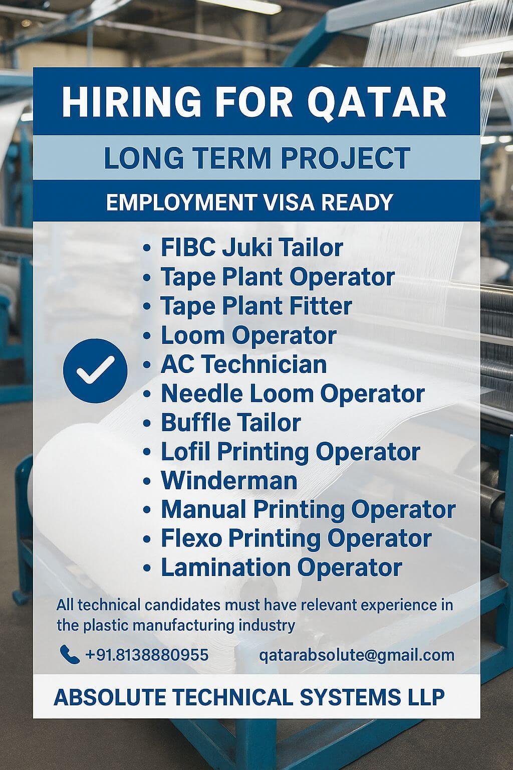 We are seeking experienced professionals for a long-term project in Qatar, with employment visas ready. The ideal candidates will have relevant experience in the plastic manufacturing industry. This is an excellent opportunity to join a dynamic team and contribute to the growth of the company.