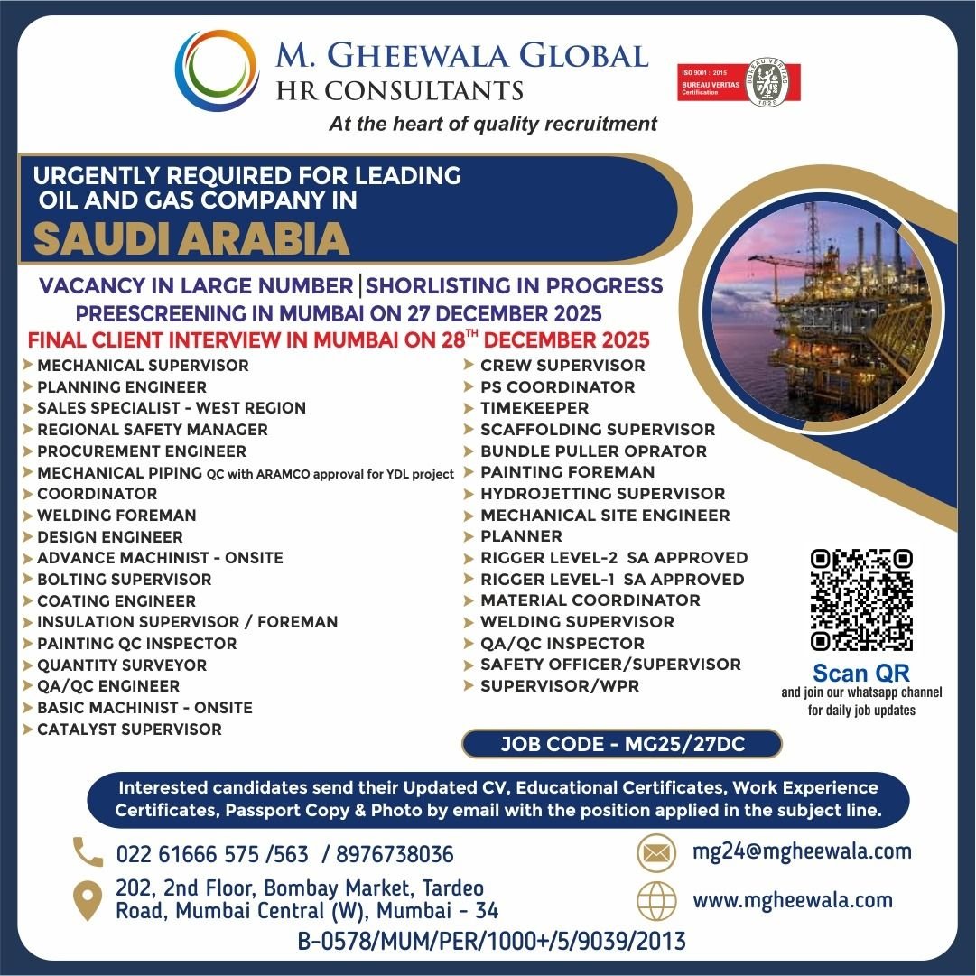 We are seeking highly skilled and experienced professionals to join a leading oil and gas company in Saudi Arabia. The company is looking to fill a large number of vacancies, with pre-screening taking place in Mumbai on December 27, 2025. This is an excellent opportunity for individuals looking to work in the oil and gas industry in the Gulf region.