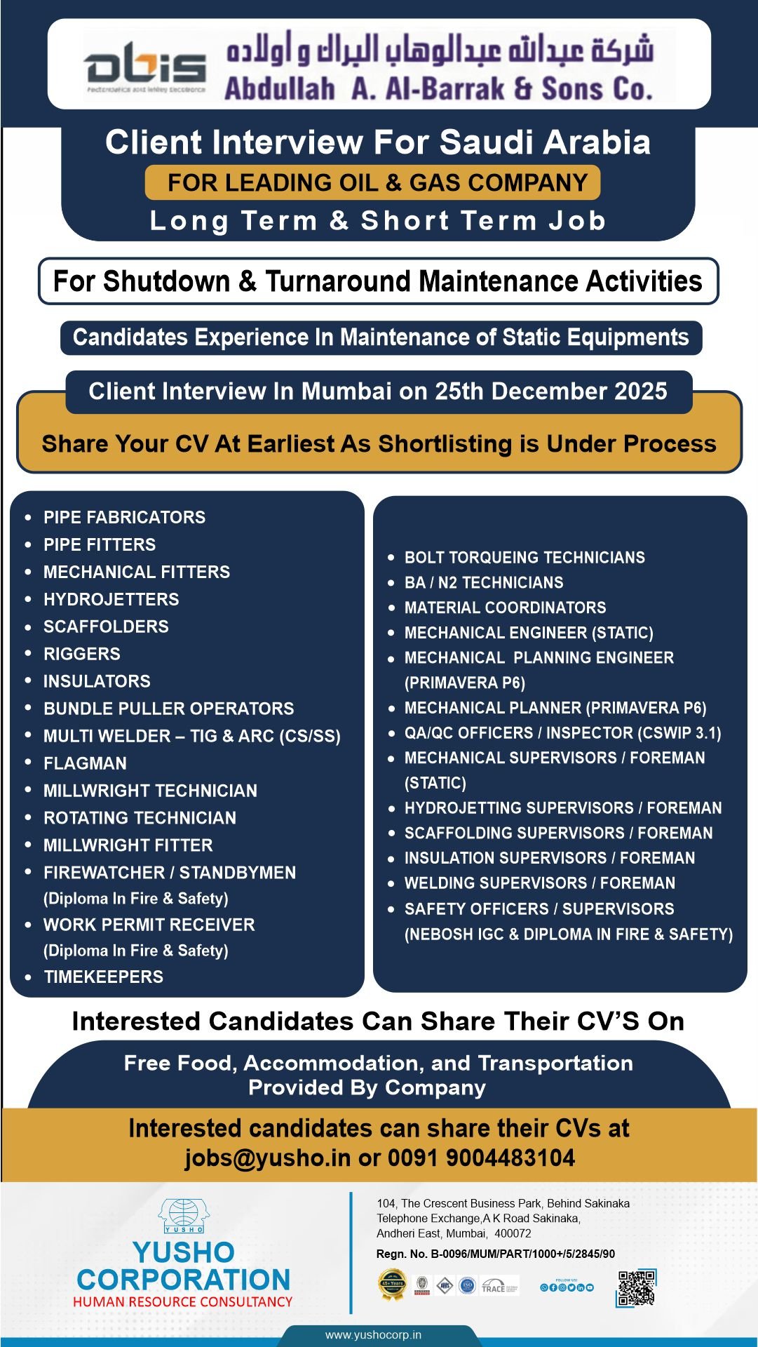 We are seeking experienced mechanical professionals for long-term and short-term job opportunities in Saudi Arabia, specifically in shutdown and turnaround maintenance activities. Candidates will have the chance to work with static equipment and participate in client interviews in Mumbai. The ideal candidates will have experience in maintenance of static equipments.