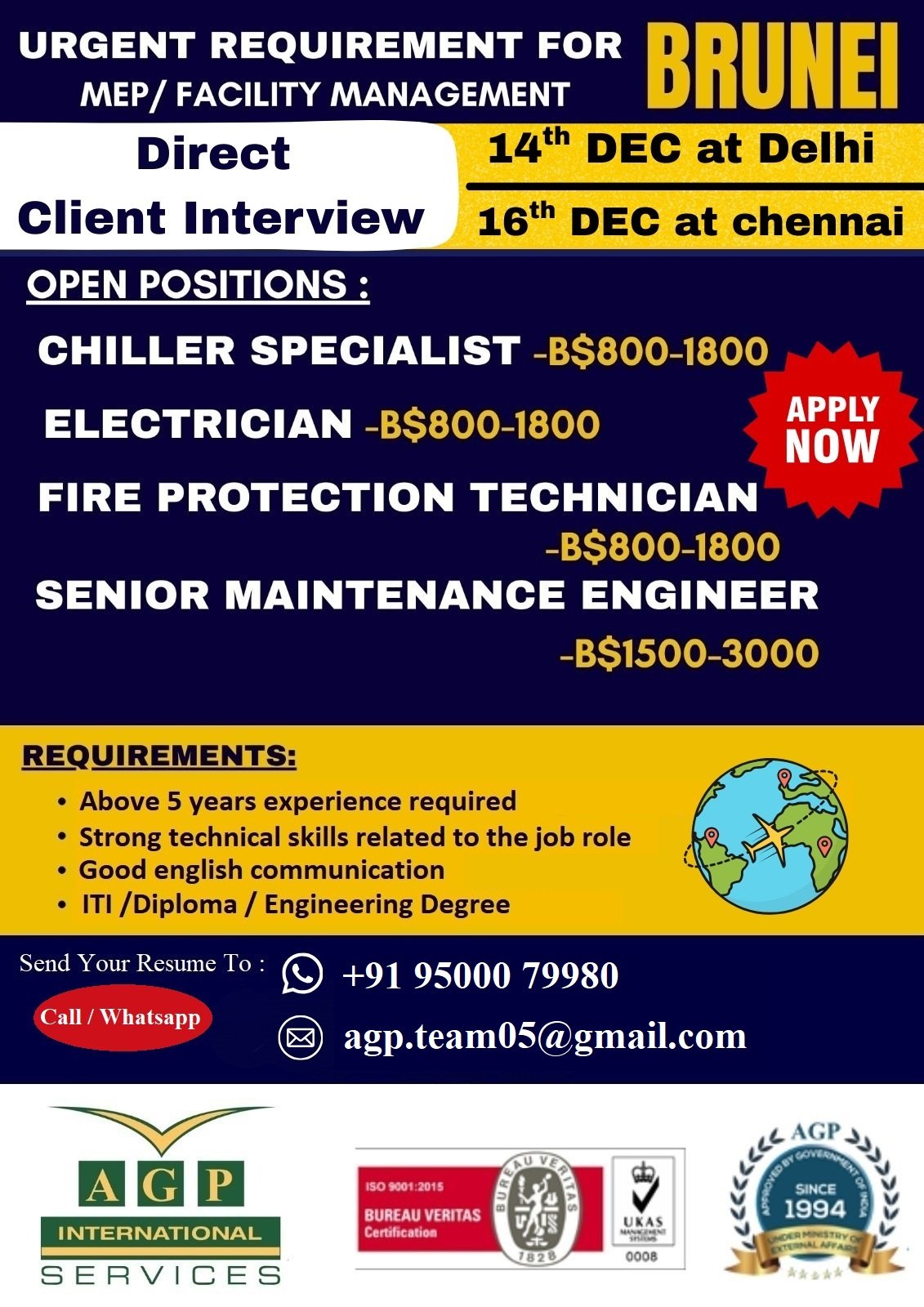 # MEP/Facility Management Jobs in Gulf – Chiller Specialist, Electrician, Fire Protection Technician, Senior Maintenance Engineer