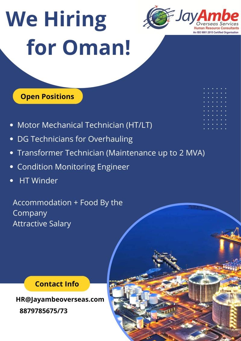 We are seeking skilled technicians to join our team in Oman. The ideal candidates will have experience in motor mechanical maintenance and overhauling. Successful candidates will be offered an attractive salary and benefits package.