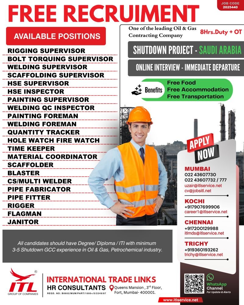 – Degree/ Diploma / ITI with minimum 3-5 years of shutdown GCC experience in Oil & Gas, Petrochemical industry