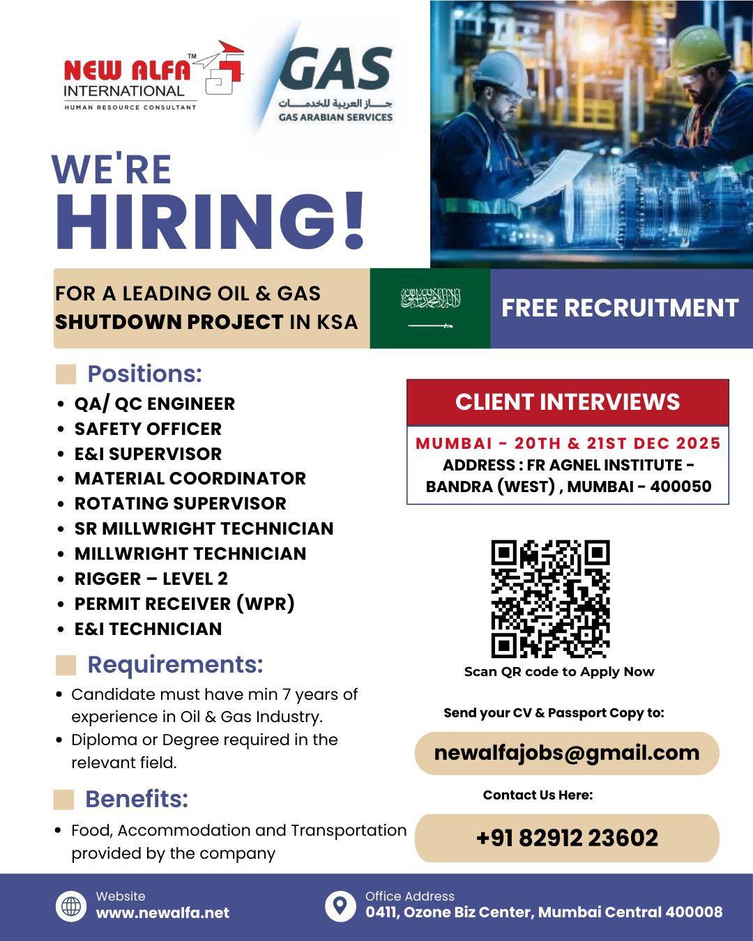 We are seeking experienced professionals for a leading oil and gas shutdown project in KSA. This is an excellent opportunity to work with a renowned company and gain valuable experience in the industry. The ideal candidates will have a strong background in oil and gas operations and a proven track record of success.