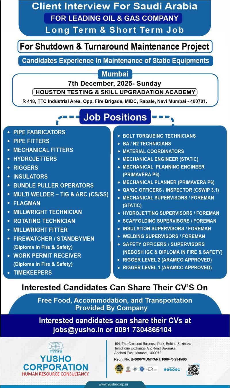 We are seeking experienced candidates for a leading oil and gas company in Saudi Arabia for long-term and short-term job opportunities. The project involves shutdown and turnaround maintenance, and candidates should have experience in maintenance of static equipment. The client interview is scheduled for 7th December 2025.