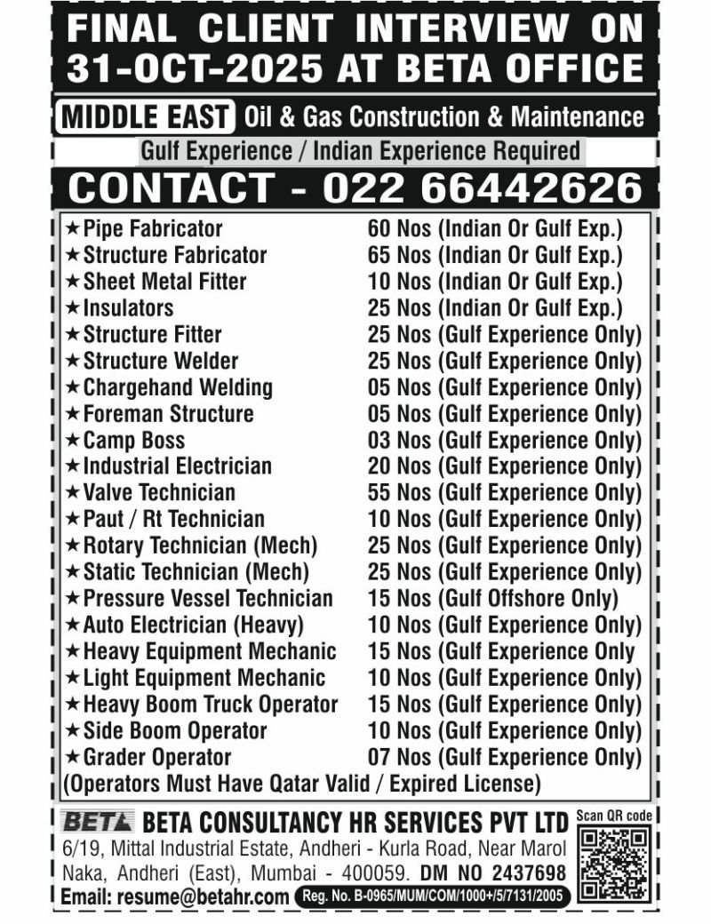 We are seeking experienced professionals for oil and gas construction and maintenance projects in Qatar. The ideal candidates will have Gulf or Indian experience in their respective fields. The final client interview is scheduled for October 31, 2025, at the Beta office.
