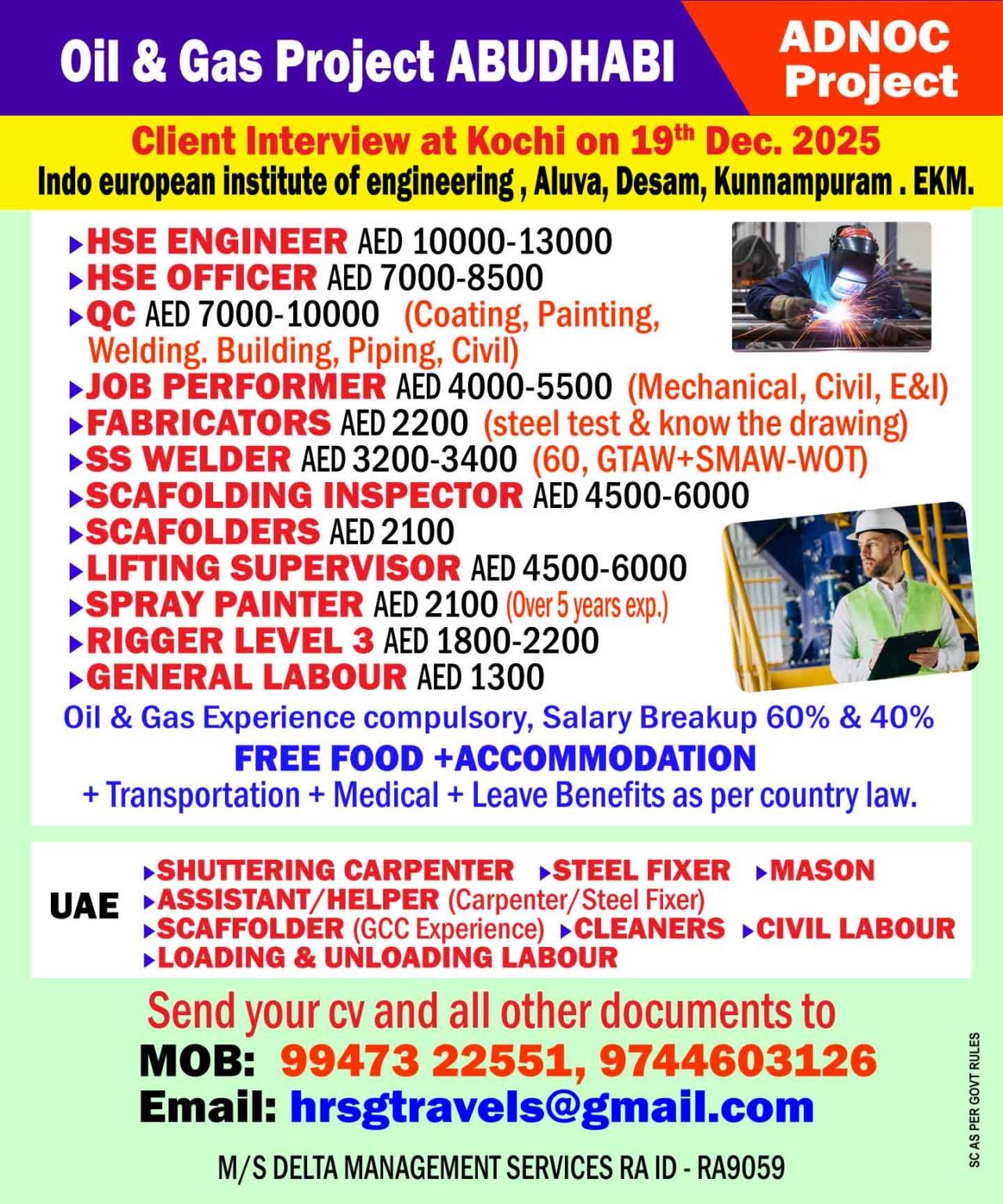 We are seeking experienced professionals to join our team in the oil and gas industry in ABUDHABI. This is an excellent opportunity to work with a leading company and gain valuable experience in the field. The company offers a range of benefits, including free food, accommodation, and transportation.