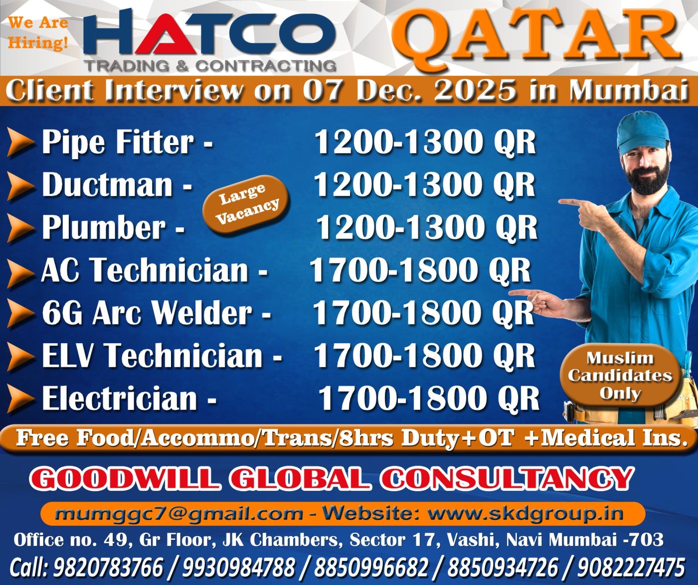 # Pipe Fitter, Ductman, Plumber, AC Technician, 6G Arc Welder, ELV Technician, and Electrician Jobs in Gulf – Multiple Positions
