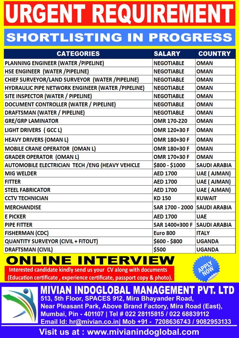 We are seeking experienced professionals to join our team in Oman, working on water and pipeline projects. The ideal candidates will have a strong background in their respective fields and be able to work effectively in a fast-paced environment. This is an excellent opportunity for those looking to advance their careers in the water and pipeline industry.