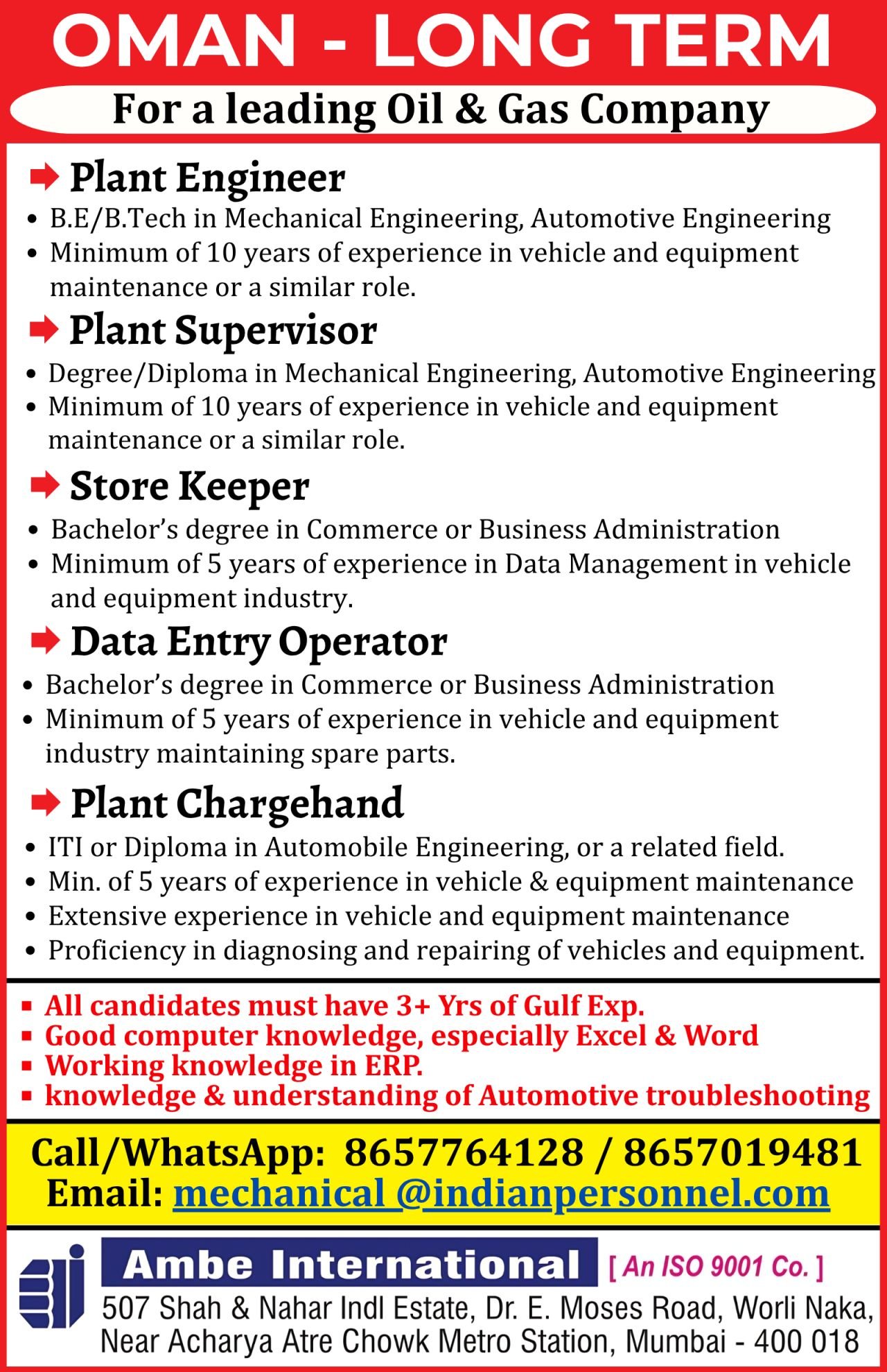 – Minimum of 10 years of experience in vehicle and equipment maintenance or a similar role for Plant Engineer and Plant Supervisor