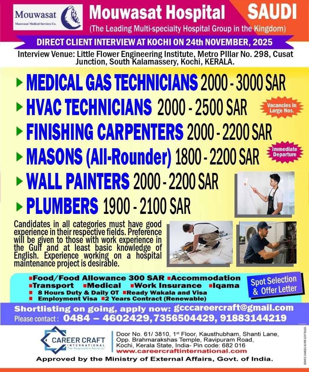 We are seeking skilled plumbers to work on a hospital maintenance project in the Gulf. The ideal candidate will have good experience in their field and basic knowledge of English. Preference will be given to those with work experience in the Gulf.
