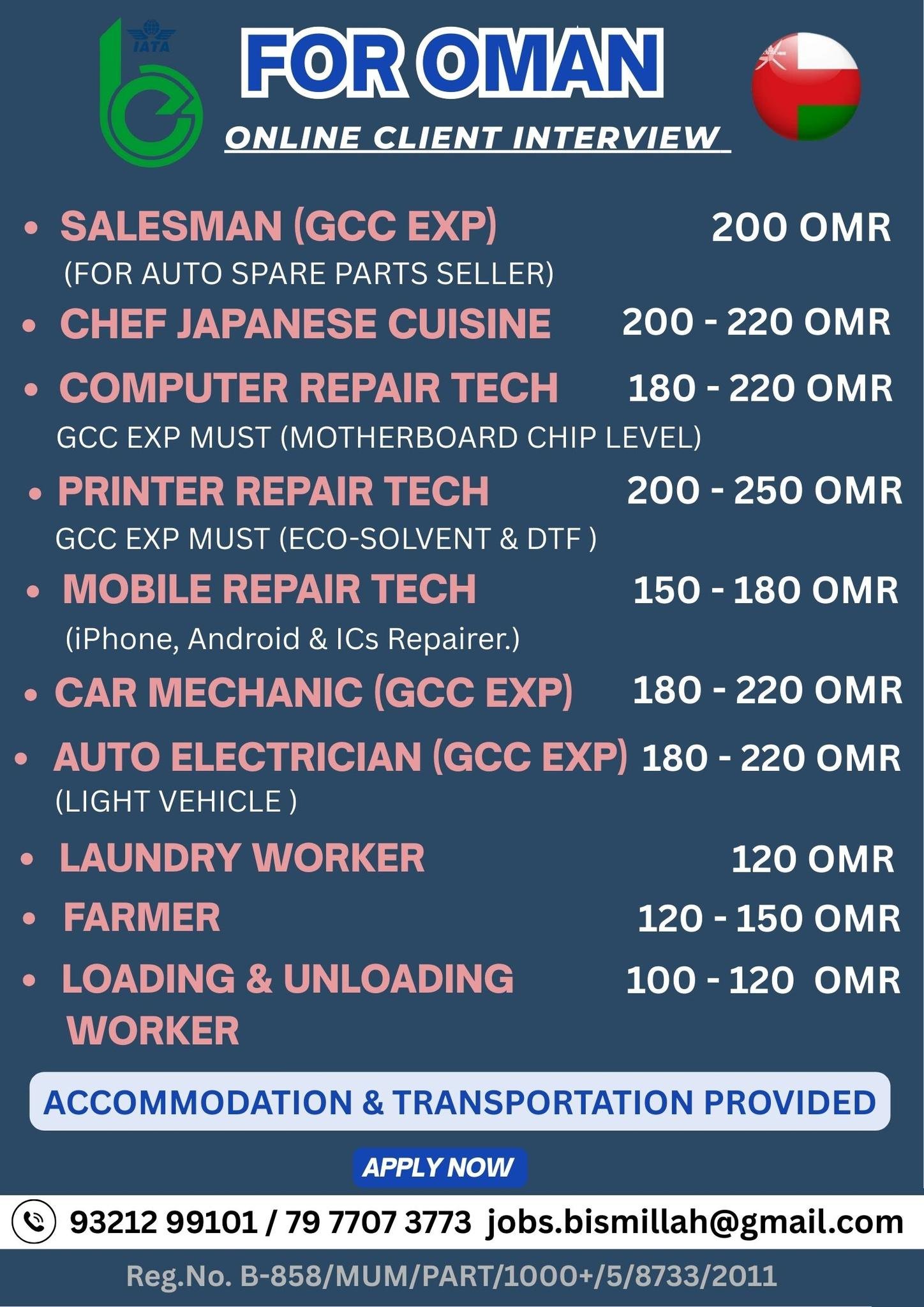 We are seeking highly skilled and experienced professionals to fill various roles in Oman. The ideal candidates will have relevant experience in their respective fields and be able to work effectively in a fast-paced environment. Successful candidates will be offered a competitive salary and benefits package.