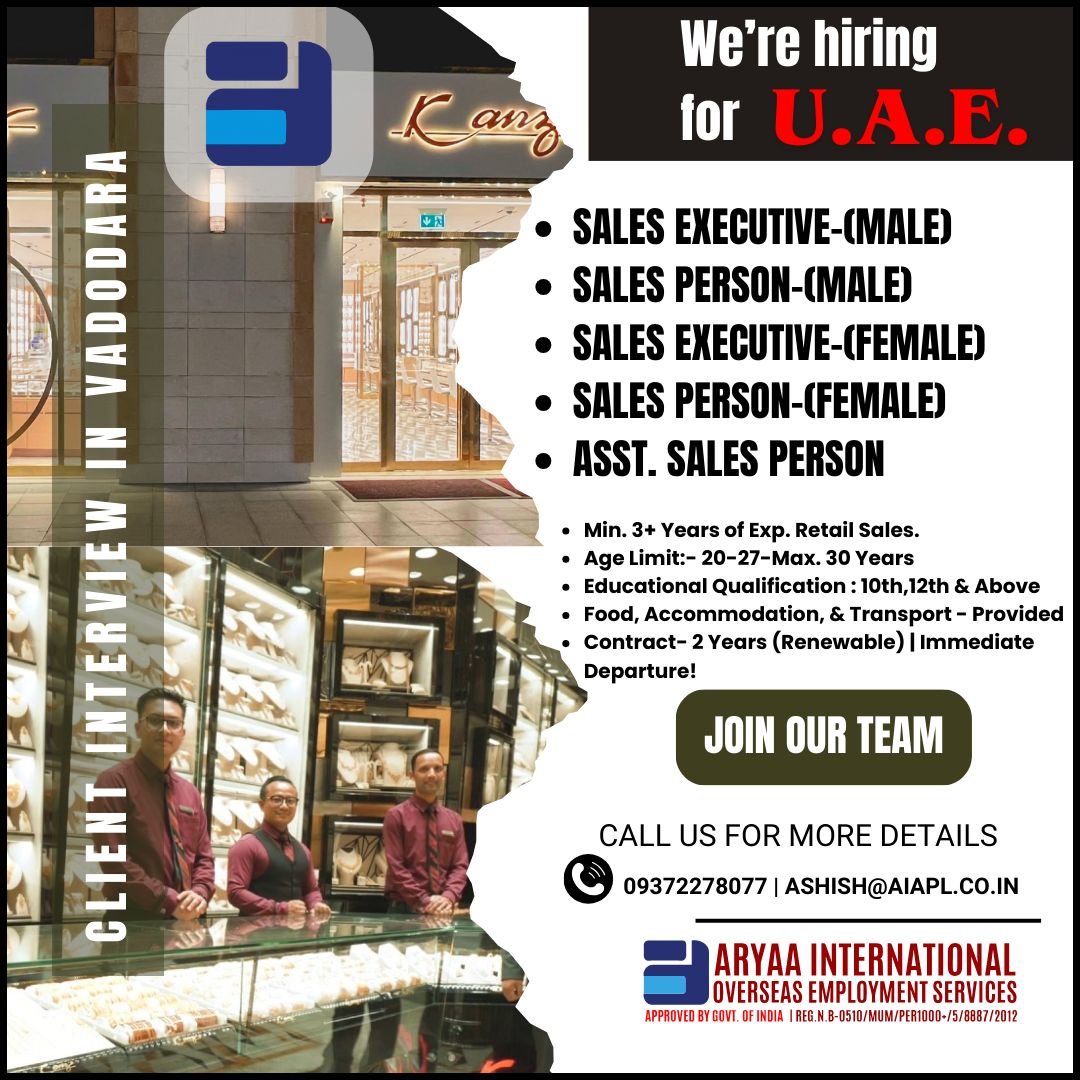 We are seeking highly motivated and experienced sales professionals to join our team in the United Arab Emirates. This is an excellent opportunity to work with a reputable company and advance your career in sales. The ideal candidates will have a strong background in retail sales and excellent communication skills.