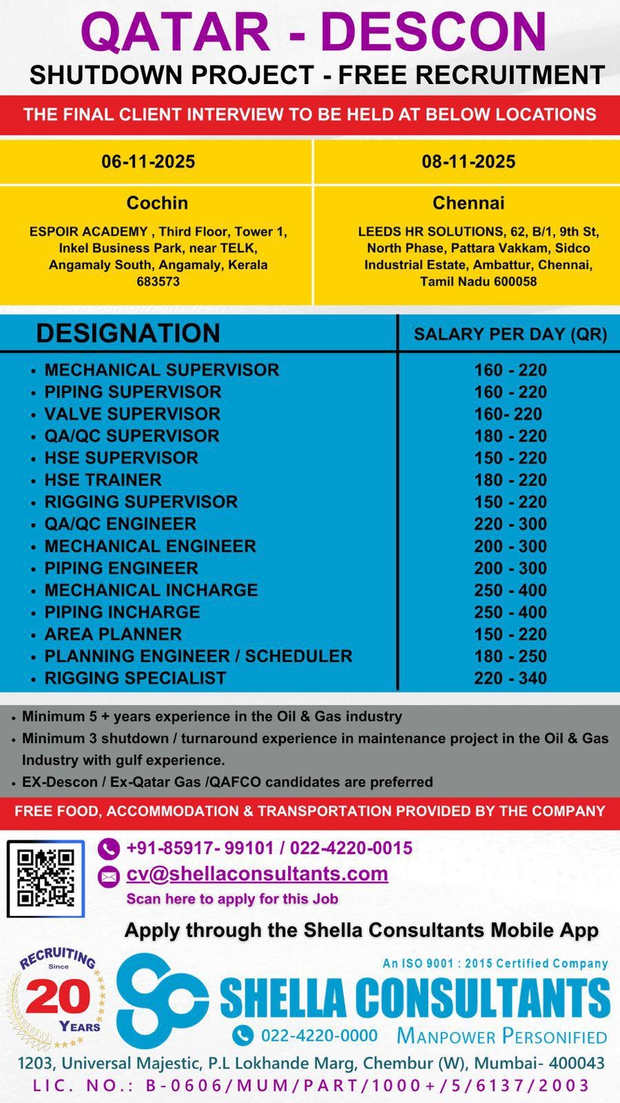 # Shutdown Project Jobs in Qatar – Mechanical, Piping, QA/QC, HSE, and Rigger Supervisor